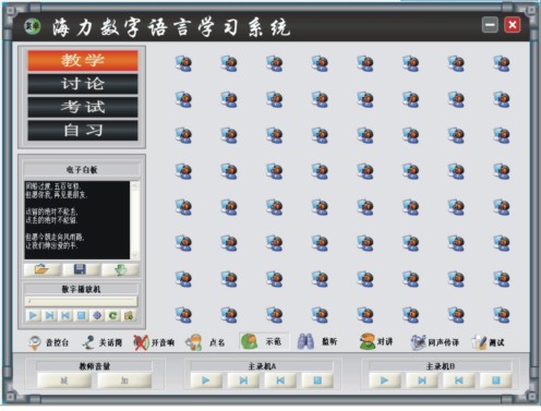 系统采用先进的DSP处理技术,开放的TCP/IP架构,并结合科学的辅助教学思想,丰富的学习资料,彻底突破了传统语音室只作单纯教学工具,非人性化的特点,大大提高学生学习效率。目前有中文版、英文版、繁体版三种版本供用户选择。